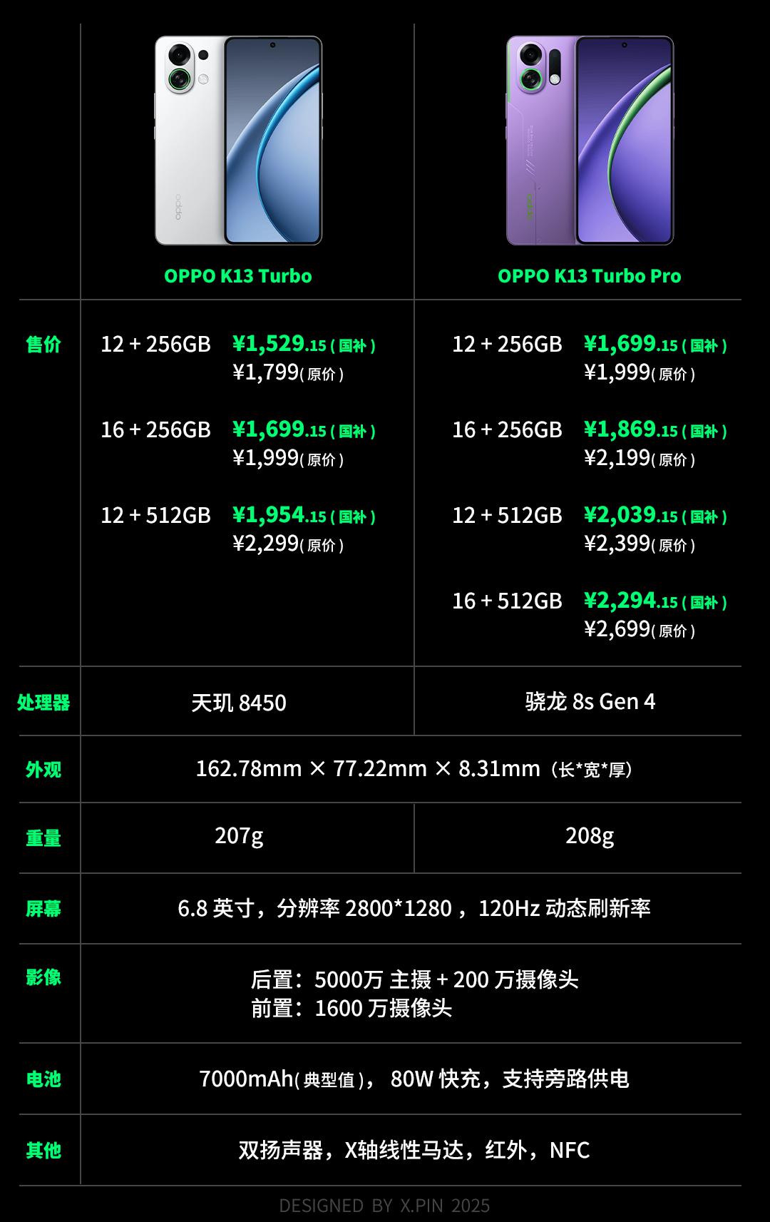 正文开始之前先给大家来一个祖传省流,放一个配置表给大家过一下。这回 OPPO 一共端来 K13 Turbo 和 K13 Turbo Pro 两款机器,除了处理器方面 Turbo 是天玑 8450 ,而 Turbo Pro 用的是骁龙 8s Gen 4,其余的配置是几乎一样的。