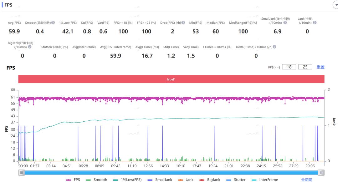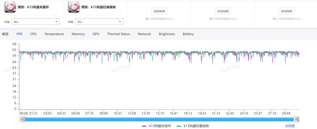 我们直接给大家测了个须弥城,风扇全开的情况下,帧率还是很稳定的,根据 Perfdog 的记录,半小时下来平均帧率 59.7 帧,跟我们之前测试的红米 Turbo 4 Pro 差不多。