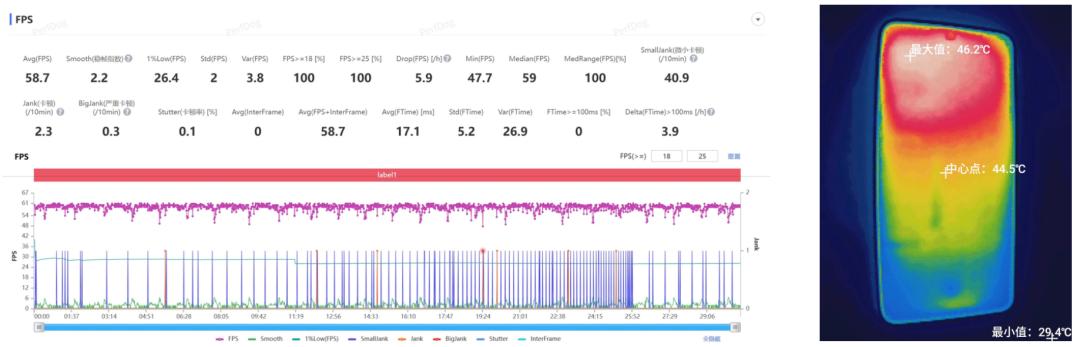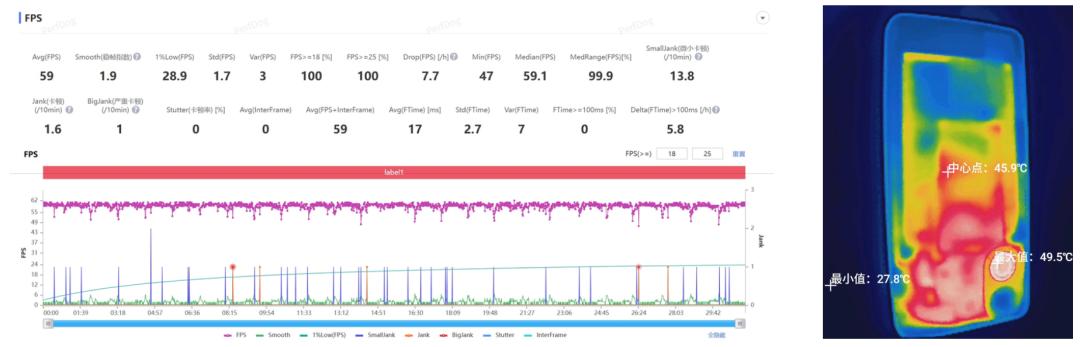 帧率开始波动了!半小时测下来平均帧率 59 帧,机身最高温度出现在背面的风扇进风口,有 49.5 度。