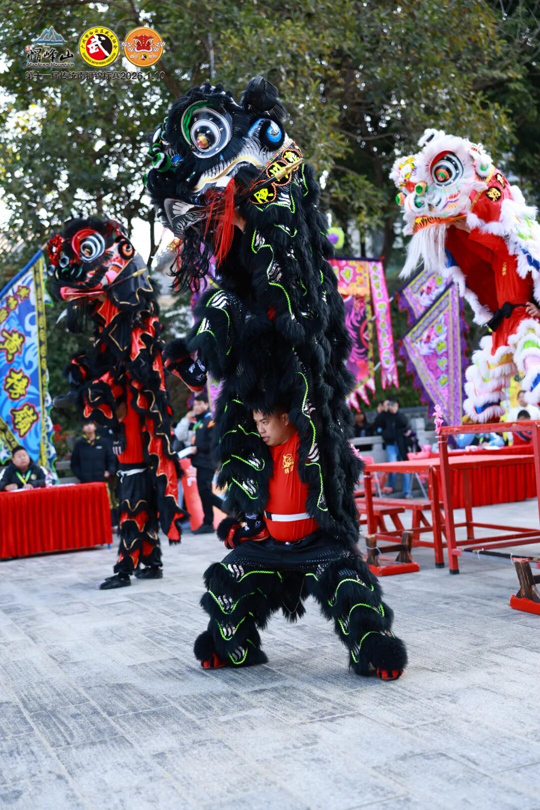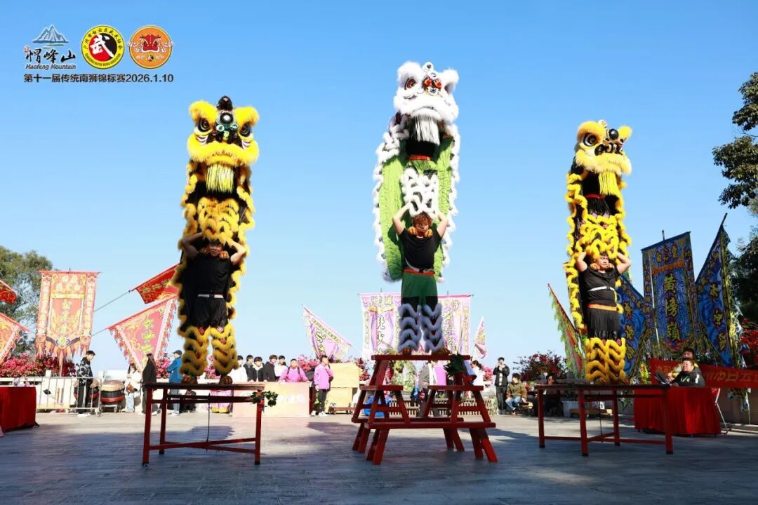 本届传统南狮锦标赛共计展示套路达82项,设传统单狮和群狮项目,分少儿组与不限年龄组。各支队伍轮番登场,在山水桃林布景中,以威猛身姿演绎传统故事。